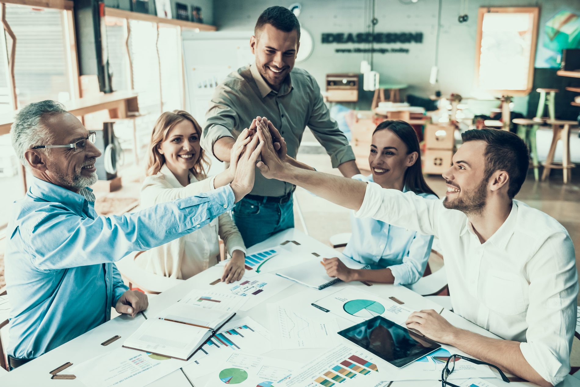 Business People at Work in Office Teamwork Concept. Group of Colleagues Sitting at Desk and Celebrating and Cheering each other for Work done. Comunication between Coworkers. Coworkers Celebrating.