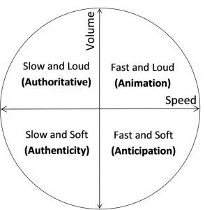 A recent post by Cal Habig suggests the use of a quadrant diagram (as modeled by Rory Vaden) to better understand vocal variety. This illustrates how we can combine attributes to create a vocal image (though he doesn’t call it a vocal image.) Cal discusses only two aspects of sound: volume and pace (speed). The quadrant contains a personality characteristic/quality of expression for each combination in the quadrant. Here is his chart: