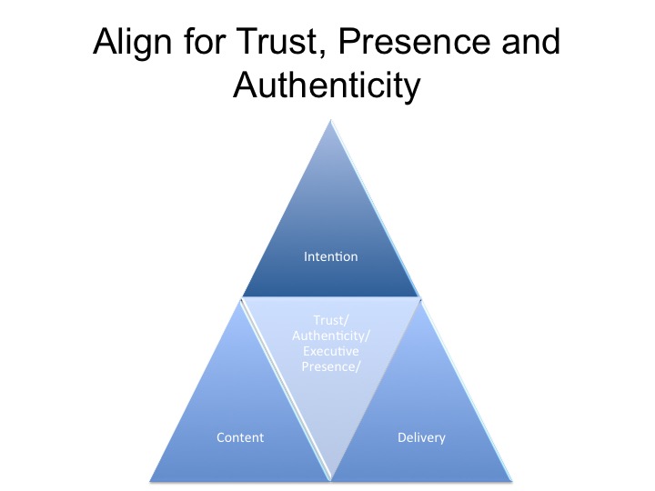 Here is how it works. Intention is the why, Content is the what, and Delivery is the how. You have to get them all to agree with each other; the result is Authenticity, Trustworthiness, and Executive Presence.